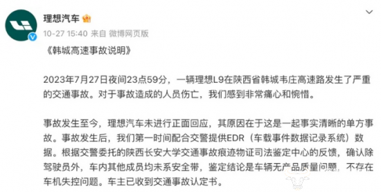 对此,理想汽车官方发表《韩城高速事故说明》表示:这是一起事实清晰的单方事故......根据交警委托的陕西长安大学交通事故痕迹物证司法鉴定中心的反馈,确认除驾驶员外,车内其他成员均未系安全带,鉴定结论是车辆无产品质量问题,不存在车机失控问题。