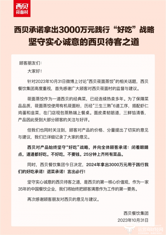 除此之外,西贝还做出了相关承诺,决定在2024年拿出3000万元用于践行他们的好吃承诺,不好吃不要钱,并于25分钟上齐所有菜品。