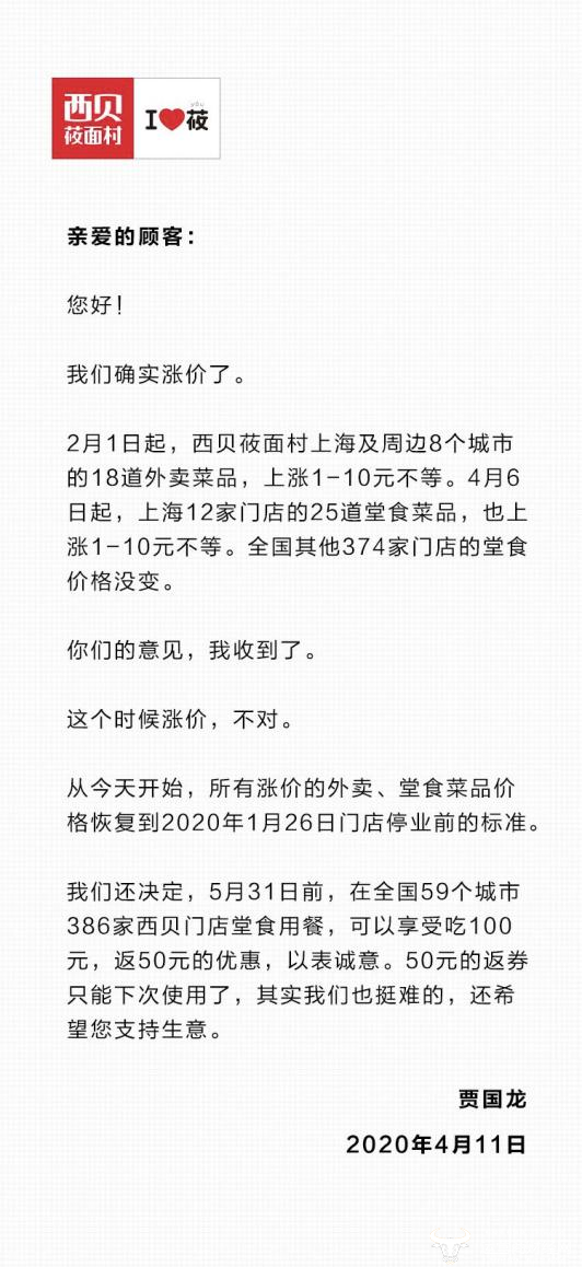 而在2020年,西贝莜面村也因为涨价被“骂”上热搜,贾国龙发布公开信表示“这个时候涨价,不对”,然后将价格回调到以往的水平。