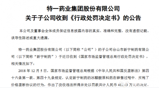 具体来讲,此事发生在几年前。2018年12月7日,特一药业发布一则关于子公司收到《行政处罚决定书》的公告,内容显示子公司台山市新宁制药于近日收到了《国家市场监督管理总局行政处罚决定书》,新宁制药因价格垄断冰醋酸原料药被罚。