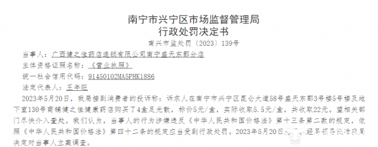 广西健之佳南宁盛天东郡分店在5月20日这一天对所售卖的部分药品调整售价,足光散这一药品由原来售价5.5元/盒调整为5元/盒,价格标签已换成5元/盒,但收费系统未及时更改价格,造成消费者购买这一药品时收费系统还是按原价结款的事实。为此被南宁市兴宁区市场监督管理局罚款了500元。