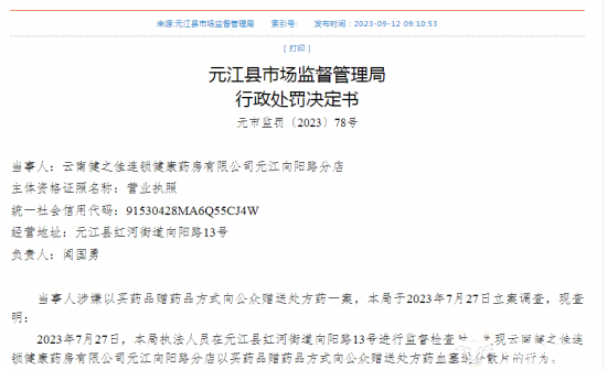 今年9月12日,元江县市场监督管理局官方网站披露一则行政处罚决定书,内容显示,健之佳旗下子公司云南健之佳的元江向阳路分店涉嫌以买药品赠药品方式向公众赠送处方药。