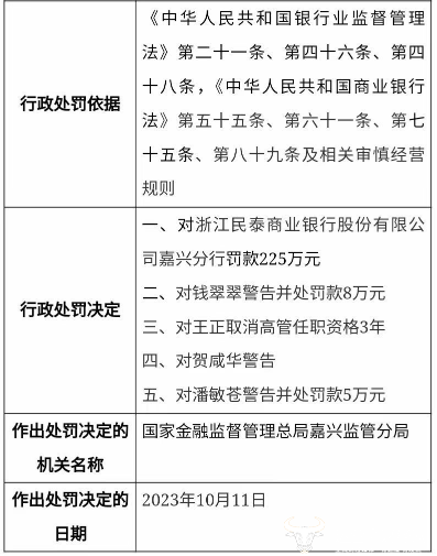 同时根据相关规定,取消浙江民泰银行嘉兴平湖支行行长王正的高管任职资格3年,对浙江民泰银行嘉兴分行行长潘敏苍警告并罚款5万元。此外,另有一名支行客户经理、一名分行行长助理被罚。