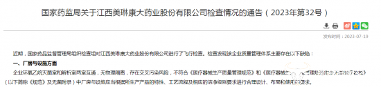 今年7月19日,国家药品监督管理局在其官方网站披露一则关于江西美琳康大药业股份有限公司检查情况的通告(2023年第32号),内容显示,国家药监局组织检查组对其进行飞行检查,发现企业质量管理体系存在两项缺陷。