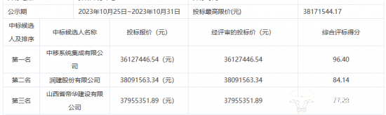 10月23日,项目开标,有四家企业参与项目招标。10月24日,评标结果公布,中移系统集成有限公司以96.4的综合评标得分位列第一候选人。此外,润建股份有限公司与山西省帝华建设有限公司分别位列第二、第三候候选人。