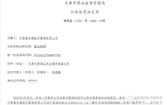 天津喜来健生产标签不符合要求的低频超声理疗仪违反了相关法律法规,因此被天津市药监局于8月4日处以罚款3万元的行政处罚。