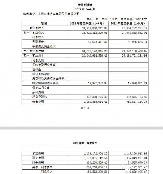日前,江淮汽车发布2023年第三季度报告引起人们的注意。报告显示,江淮汽车营收和净利润双双增长。不过,与此同时,营业成本也“水涨船高”,其中是销售费用占了大头还是研发费用占了大头呢?本次运营商财经网试图分析。
