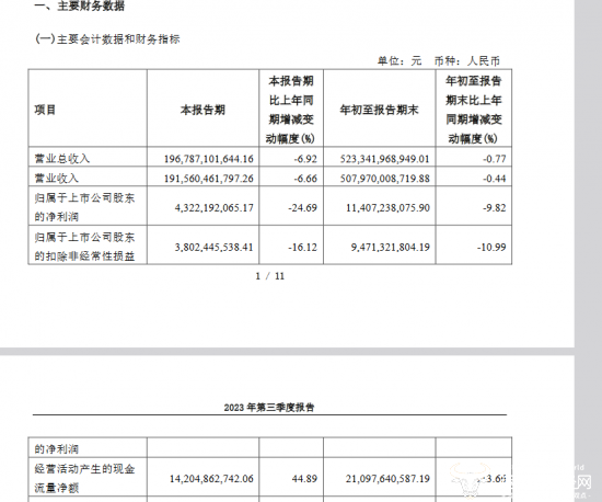 此外,公司第三季度归属于上市公司股东的净利润约为43.22亿元,同比下降24.69%(2022年同期约为57亿元);归属于上市公司股东的扣除非经常性损益约为38亿元,同比下降16.12%。