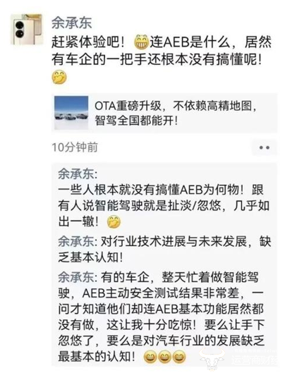 众所周知,问界新M7是赛力斯和华为通力合作的产品,近期热度颇高。采访内容逐渐在网上发酵后,网上流传出一张疑似华为智能汽车解决方案BU董事长余承东的朋友圈截图。截图内容显示:连AEB是什么,居然有车企的一把手还根本没有搞懂呢!