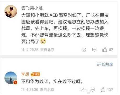 有网友在理想汽车CEO李想的社交媒体下留言称:建议理想立刻想办法加入战局......李想回复表示:不和华为吵架,实在吵不过呀。