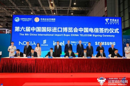 2023年11月6日,在第六届中国国际进口博览会上,中国电信与诺基亚、爱立信、英特尔、戴尔、三星等5家国际合作伙伴达成采购合作意向。采购范围涵盖无线、数据和传输、固网终端、服务器、CPU、手机终端等设备及服务。中国电信副总经理李峻及5家国际合作伙伴代表出席了签约仪式。