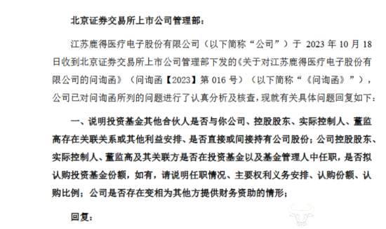 而值得注意的是,在上述公告发布的同日,鹿得医疗也披露了一则收到北交所问询函的公告,要求鹿得医疗结合公司目前流动资金状况,说明参与设立该投资基金是否会对公司的正常生产经营造成不利影响等5个问题。