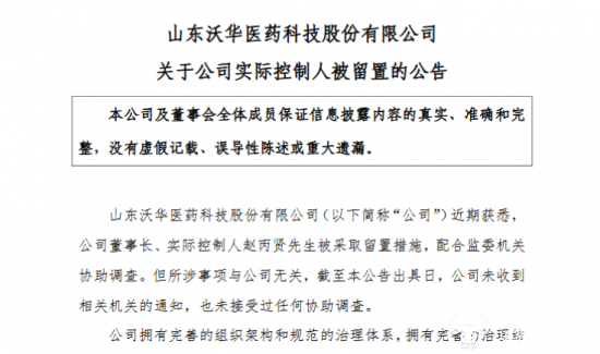 11月7日,沃华医药对外发布公司实控人被留置的公告,称公司于近日获悉董事长、实际控制人赵丙贤被采取留置措施,配合监委机关协助调查。但至于其被留置的具体原因,沃华医药则并未进行披露,只强调所涉事项与公司无关,截至公告出具日,沃华医药也未收到相关机关的通知,未接受过任何协助的调查,并表明公司也尚未知悉留置调查的进展及结论,同时会密切关注该事的最新进展情况。