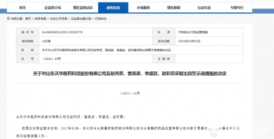 值得一提的是,赵丙贤曾经还因信披违规收到过警示函。2021年3月2日,赵丙贤对沃华医药、赵丙贤及公司总裁曾英姿、副董事长兼董秘赵彩霞下发采取出具警示函措施的决定。山东证监局称在日常监管中发现,2017年以来,沃华医药与云南腾药制药及云南腾药药品经营有限公司关联交易事项未履行董事会审议程序及信息披露义务。