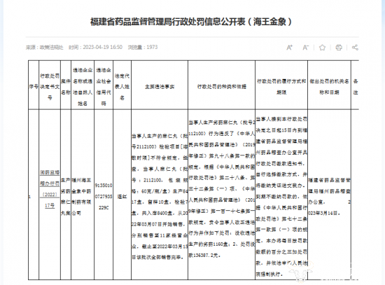 今年4月19日,福建省药品监督管理局披露一则行政处罚信息,行政处罚决定书文号为闽药监榕稽办行罚〔2022〕17号。
