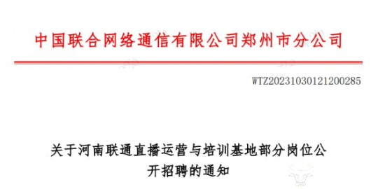 不仅如此,河南联通今年在直播团队上“招兵买马”,正不断补足人才。月前,网上曾流传关于河南联通直播运营与培训基地部分岗位公开招聘的通知。