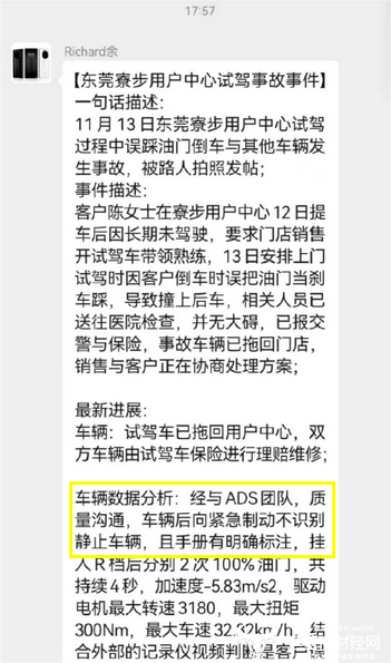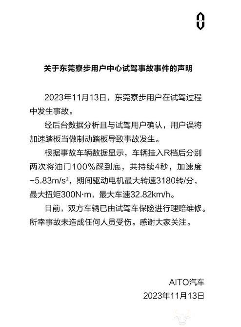 11月13日,AITO汽车官方发布《关于东莞寮步用户中心试驾事故事件的声明》表示:2023年11月13日,东莞寮步用户在试驾过程中发生事故。经后台数据分析且与试驾用户确认,用户误将加速踏板当做制动踏板导致事故发生。