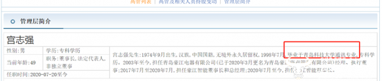 公开资料显示,宫志强出生于1974年9月,并于1998年毕业于青岛科技大学通讯专业,获得专科学历,彼时他已经24岁。