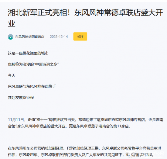2022年,网上一篇名为《湘北新军正式亮相!东风风神常德卓联店盛大开业》的文章披露,在东风风神某店开业仪式上,王鹏作为东风乘用车公司营销总部副经理、F营销部总经理进行了讲话。通过图片资料来看,确是王鹏本人。