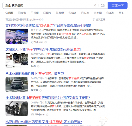 看来,这个“道歉”不是大众意义里的“道歉”。目前,在搜索引擎搜索“车企 筷子悬架”关键词,会发现大多数文章都在谈论比亚迪的“筷子悬架”。当然,淦家阅并没有直接提及是哪家汽车公司。