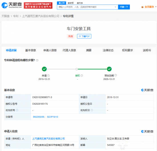 天眼查APP显示,2010年一个名为《车门安装工具》的专利中,王伟森就以发明人的身份出现在申请人信息中,该专利申请人是上汽通用五菱汽车股份有限公司。如果两个王伟森是同一个人,说明他已经在上汽通用五菱工作了很多年,且在技术方面小有成就。