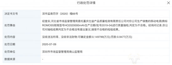 2020年7月9日,罗马仕就被河北市场监督管理局委托重庆仕益产品质量检测有限责任公司对公司生产销售的移动电源(商标ROMOSS规格型号HO2020000mAh)进行质量抽检,判定为不合格。