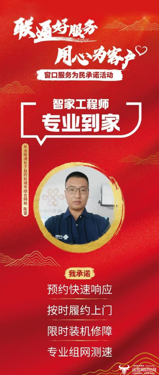 他是中国联通智家工程师队伍中的普通一员,在自己平凡的工作岗位上兢兢业业,始终把用户的需要放在第一位,至诚至精的服务得到了用户的赞誉。他就是山西长治联通智家工程师陈雷,以其出色的工作表现和用户至上的服务精神,成为了这个长治联通智家工程师队伍中的一颗明星。