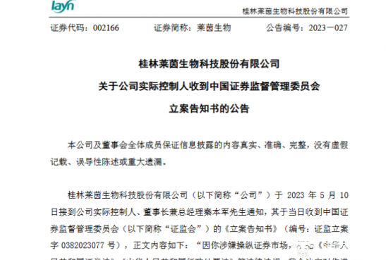 运营商财经网从莱茵生物在5月11日发布的公告中获悉,莱茵生物在5月10日时收到了秦本军的通知,他在当日收到了中国证券监督管理委员会的《立案告知书》。而秦本军被立案调查的原因是,涉嫌操纵证券市场。