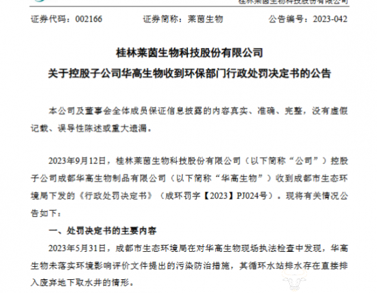 9月14日,莱茵生物发布关于控股子公司华高生物收到环保部门行政处罚决定书的公告。内容显示,华高生物在9月12日时收到成都市生态环境局下发的《行政处罚决定书》(成环罚字【2023】PJ024号)。
