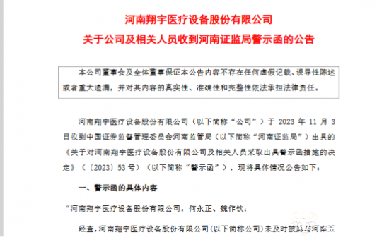 对于上述行为,公司董事长兼总经理何永正,以及时任秘书魏作钦对此负有主要责任,因此,河南证监局对翔宇医疗及何永正、魏作钦采取了出具警示函的行政监管措施,并记入证券期货市场诚信档案。
