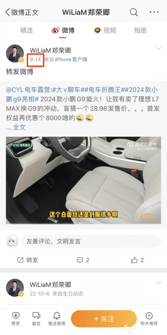 2022年郑荣卿消失了一段时间,网络上没有披露其相关任职情况,他的个人社媒平台在这期间也没有更新。一直到今年9月,郑荣卿才开始重新活跃并开始转发小鹏汽车相关内容。可能是今年低调入职小鹏,担任平台产品营销总监。