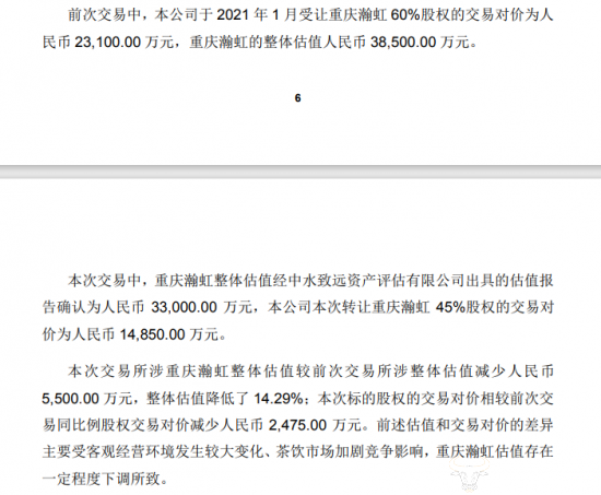 事实上,此次交易所涉重庆瀚虹整体估值较前次交易所涉整体估值减少人民币5500万元,整体估值降低了 14.29%;本次标的股权的交易对价相较前次交易同比例股权交易对价减少人民币 2,475.00 万元。