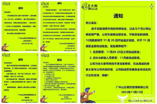 但在今年11月,在社交媒体平台上,有多位丘大叔的员工发布帖子,称丘大叔出现拖欠员工工资情况,还贴上了公司所发布的多份通知,其欠薪理由包括受台风和暴雨影响,公司业绩损失惨重;消费市场的持续低迷,公司业绩受损严重等。