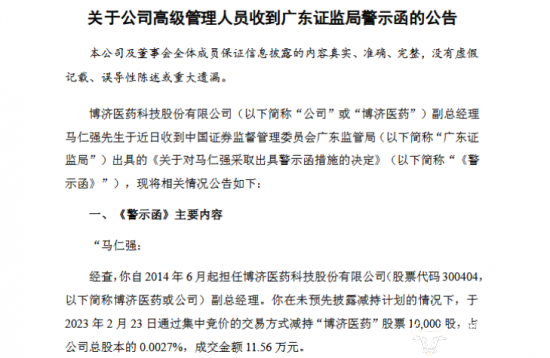 5月23日,博济医药发布公告,马仁强在未预先披露减持计划的情况下,于今年2月23日通过集中竞价方式减持1万股,套现11.56万元,构成违法违规行为。
