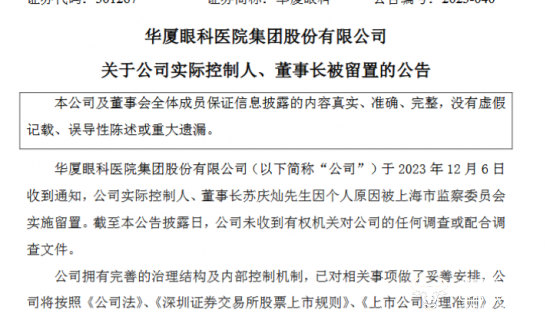 华厦眼科表示,截至到公告披露日,公司未收到有权机关对公司的任何调查或配合调查文件,同时强调公司生产经营及管理情况正常,苏庆灿被留置的事项不会对公司正常生产经营产生重大影响。