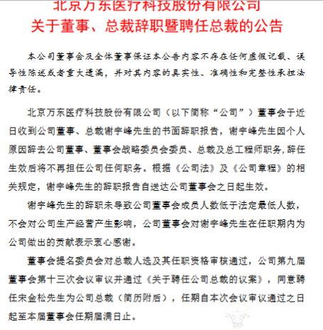 与谢宇峰辞职同时发布的还有新任总裁的任命。万东医疗聘任宋金松为新一届总裁。