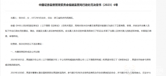 11月30日,中国证券监督管理委员会福建监管局发布一则行政处罚决定书(2023)6号,涉案人员为张永纪,是姚成志的前妻。