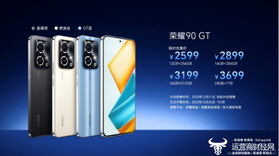 荣耀90 GT共推出12GB+256GB、16GB+256GB、16GB +512GB、24GB+1TB四个版本,售价分别是2699元、2899元、3199元、3699元,12月21日即刻开启预售,12月26日10:08正式开售。即刻起,上荣耀商城,荣耀亲选商城,京东天猫抖音等各大授权电商平台,全款预订,即享至高100元优惠及6期免息。