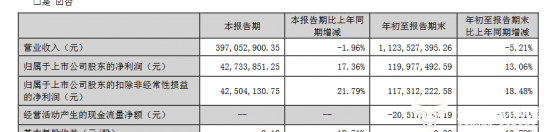 今年三季度,南山智尚实现营业收入约11.24亿元,与上年同期相比下降了5.21%,但归母净利润及扣非净利润均有所上升,分别增加13.06%至1.20亿元、18.48%至1.17亿元。