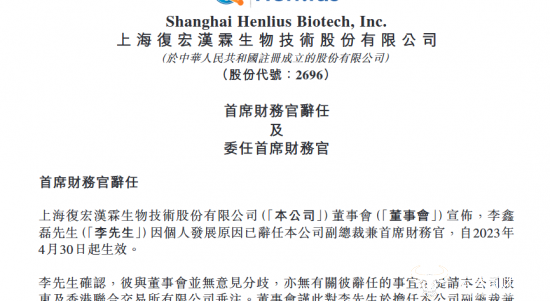 5月1日,复宏汉霖发布公告,李鑫磊因个人原因已辞任公司副总裁兼首席财务官,自4月30日起生效。与此消息一同发布的还有新任首席财务官的任命,即由朱俊来接替李鑫磊。
