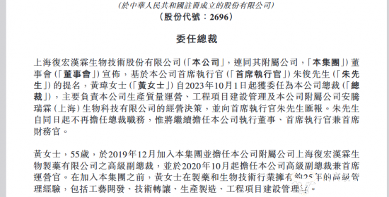 10月3日,复宏汉霖发布一则委任总裁的公告,原总裁不干了吗?为什么呢?复宏汉霖表示,经公司首席执行官朱俊提名,黄玮自10月1日起获任为公司总裁,主要负责公司生产质量运营、工程项目建设管理及公司附属公司安腾瑞霖(上海)生物科技有限公司的经营决策,并向朱俊汇报。