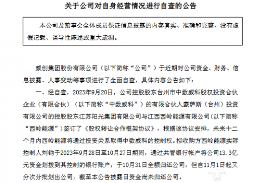在今年9月20日时,威创股份控股股东台州市中数威科的有限合伙人蒙萨斯(台州)投资有限公司的控股股东江苏阳光集团与江西西岭能源签订了《股权转让合作框架协议》,根据协议,未来十二个月内西岭能源将通过投资关系取得中数威科的控制权。