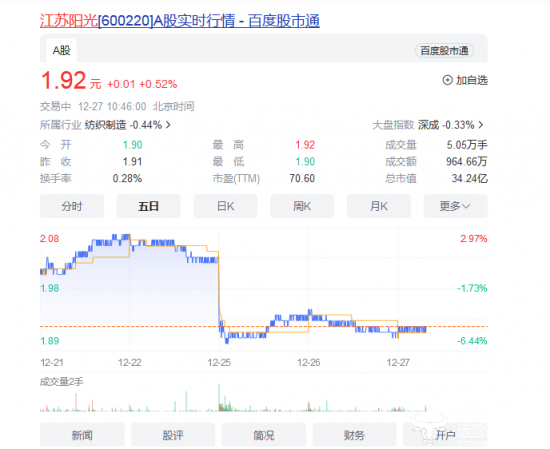 上述消息一出,12月25日,江苏阳光等三家公司早盘股价就出现断崖式下跌,截至当日收盘,江苏阳光的股价下跌5.39%,股价报收1.93元/股;12月16日,江苏阳光收盘时股价报收1.91元/股,12月27日早开1.90元/股,股价仍处于低位。