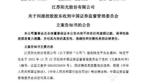 12月24日晚间,江苏阳光发布公告称,陆克平于23日收到了中国证券监督管理委员会下发的《立案告知书》,因涉嫌信息披露违法违规,中国证监会决定对其立案。江苏阳光表示,陆克平被立案调查的事项与江苏阳光无关。