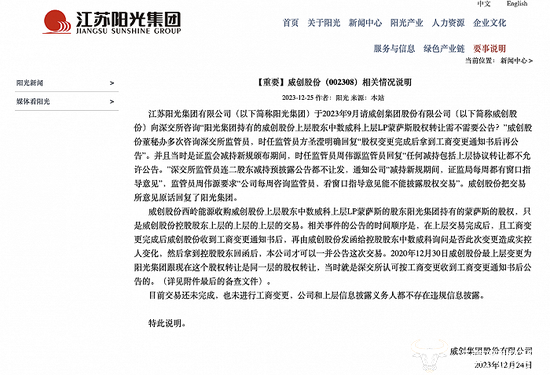 还值得一提的是,在事情发生后,江苏阳光曾于12月25日在集团官网发布一则情况说明,表示江西西岭能源收购威创股份只是威创股份控股股东上层的上层的上层的交易。目前交易还未完成,也未进行工商变更,公司和上层信息披露义务人员都不存在违规信息披露。