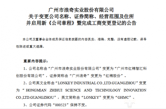 12月13日,广州浪奇发布一则关于变更公司名称、证券简称、经营范围及住所并启用新《公司章程》暨完成工商变更登记的公告,内容显示,公司名称由“广州浪奇实业股份有限公司”变更为“广州市红棉智汇科创股份有限公司”,证券简称由“广州浪奇”变更为“红棉股份”。