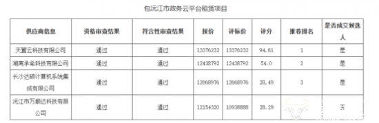 值得注意的是,该项目共有四家供应商参与投标,除了天翼云科技外,还有湖南承希科技有限公司、长沙达硕计算机系统集成有限公司、沅江市万顺达科技有限公司三家民营企业。从投标价格来看,中标的天翼云科技报价竟然是最高的。在投标企业中,甚至有一家公司的评标价格低至10938888元,与天翼云的评标价相差约244万。