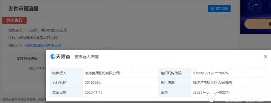 值得注意的是,前不久天眼查显示,哈药股份新增一条被强制执行信息。执行法院为哈尔滨市松北区人民法院,执行标的约501.95万元,相关案号为(2023)黑0109执6822号。