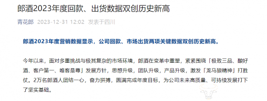 12月31日,郎酒官微发布消息透露:郎酒2023年度营销数据显示,公司回款、市场出货两项关键数据双创历史新高。