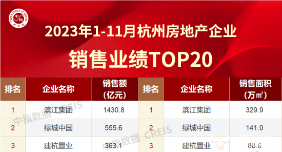 据中指研究院数据显示,今年前11个月,绿城中国以555.6亿元的销售额、141万方的销售面积居杭州房地产企业销售业绩榜TOP2,仅次于滨江集团。